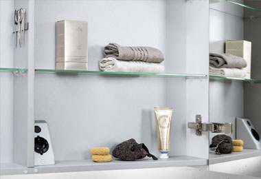 Alle Spiegeltüren sind gedämpft. Weiterhin sind die Spiegelschränke mit einem Dosen/ Schalterelement, Magnetleiste und einer Aufbau- und Unterbauleuchte ausgestattet.